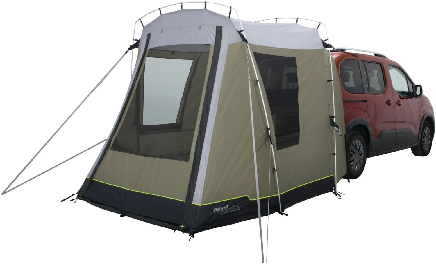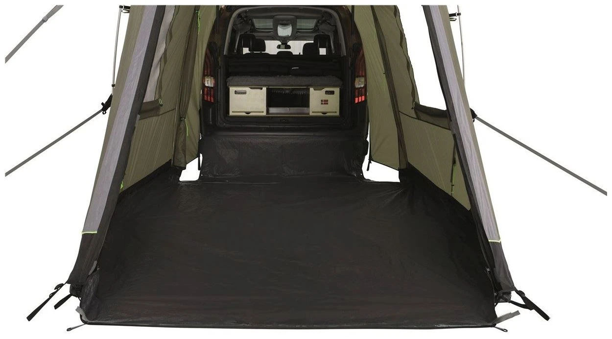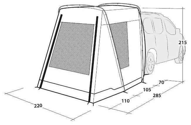 An ideal choice for couples and families seeking to extend the use of small vans on outdoor adventures, the tailgate-mounted Outwell Dunecrest vehicle awning offers great standing height, large mesh windows with waterproof curtains, detachable groundsheet, easy access and the option to use the main door as a canopy.